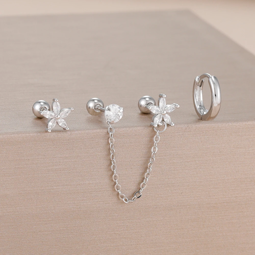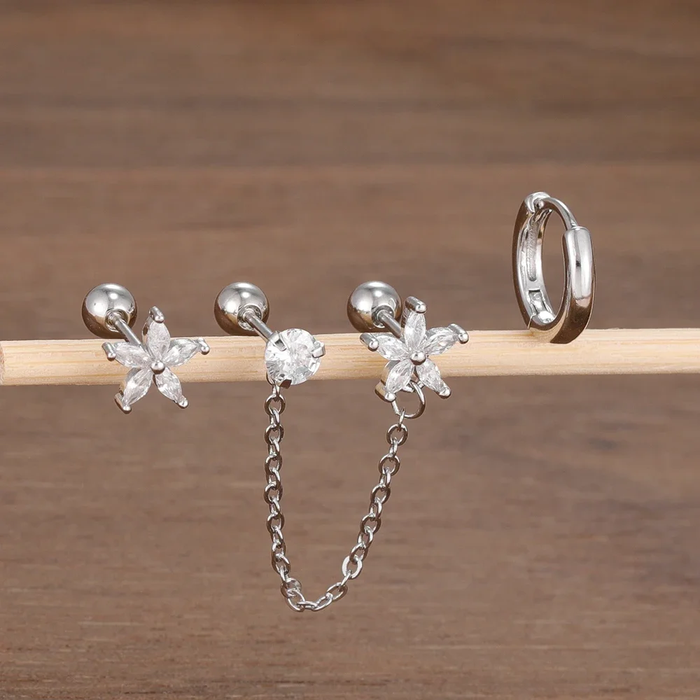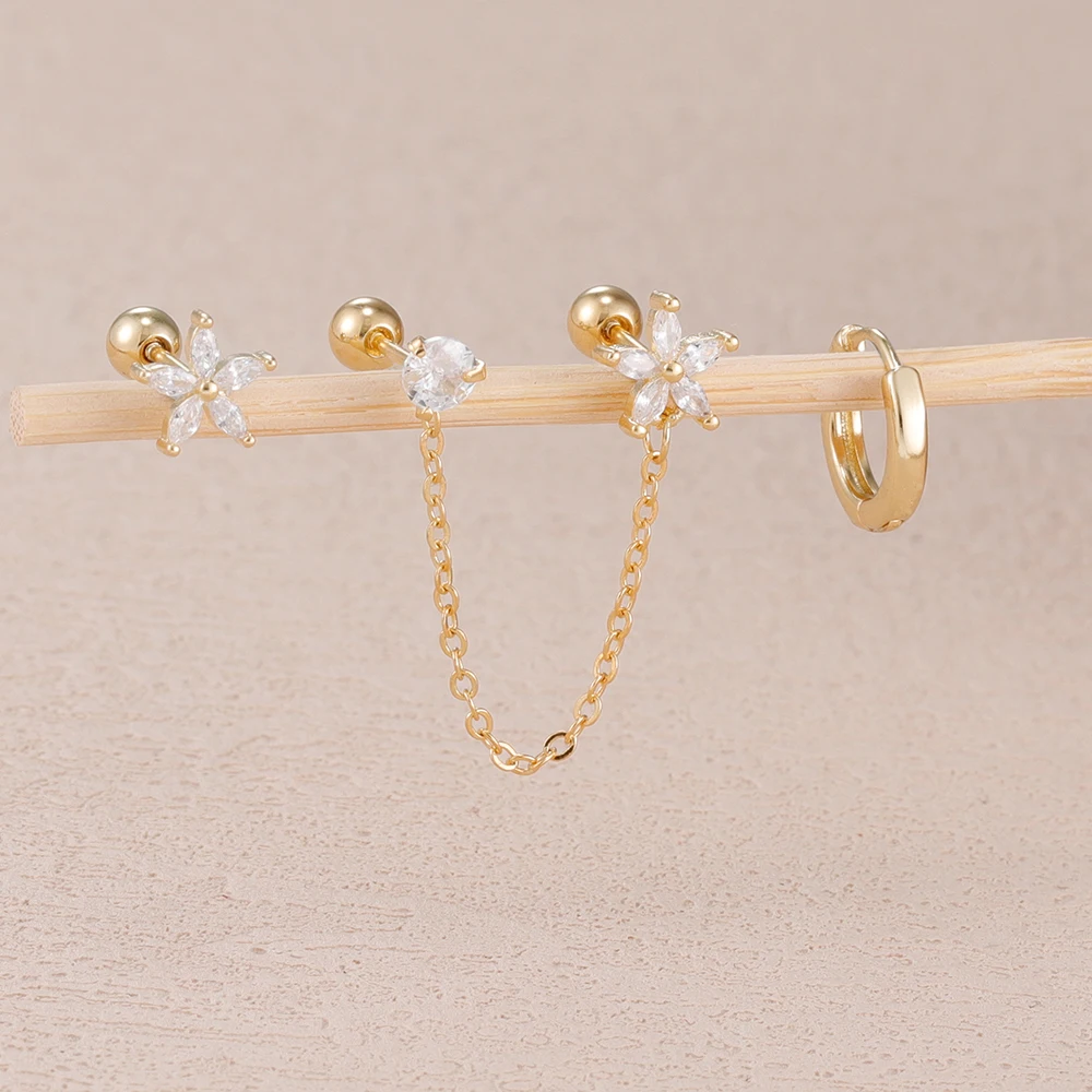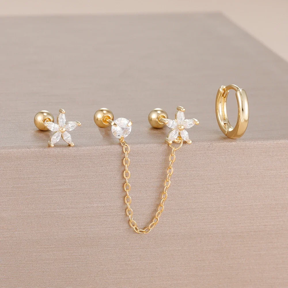 3PCS Stainless Steel Zircon Flower Star Ear Stud Earrings Set 14K Gold Plated Chain Cartilage Piercing Earring Women's Jewelry