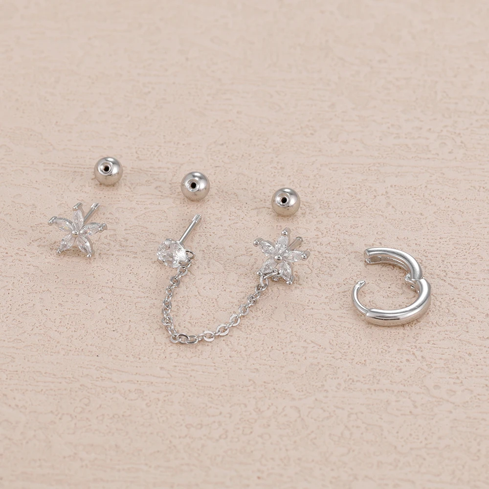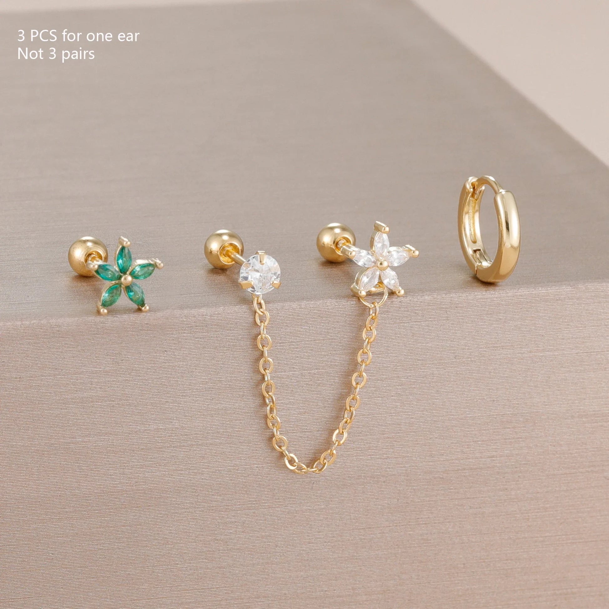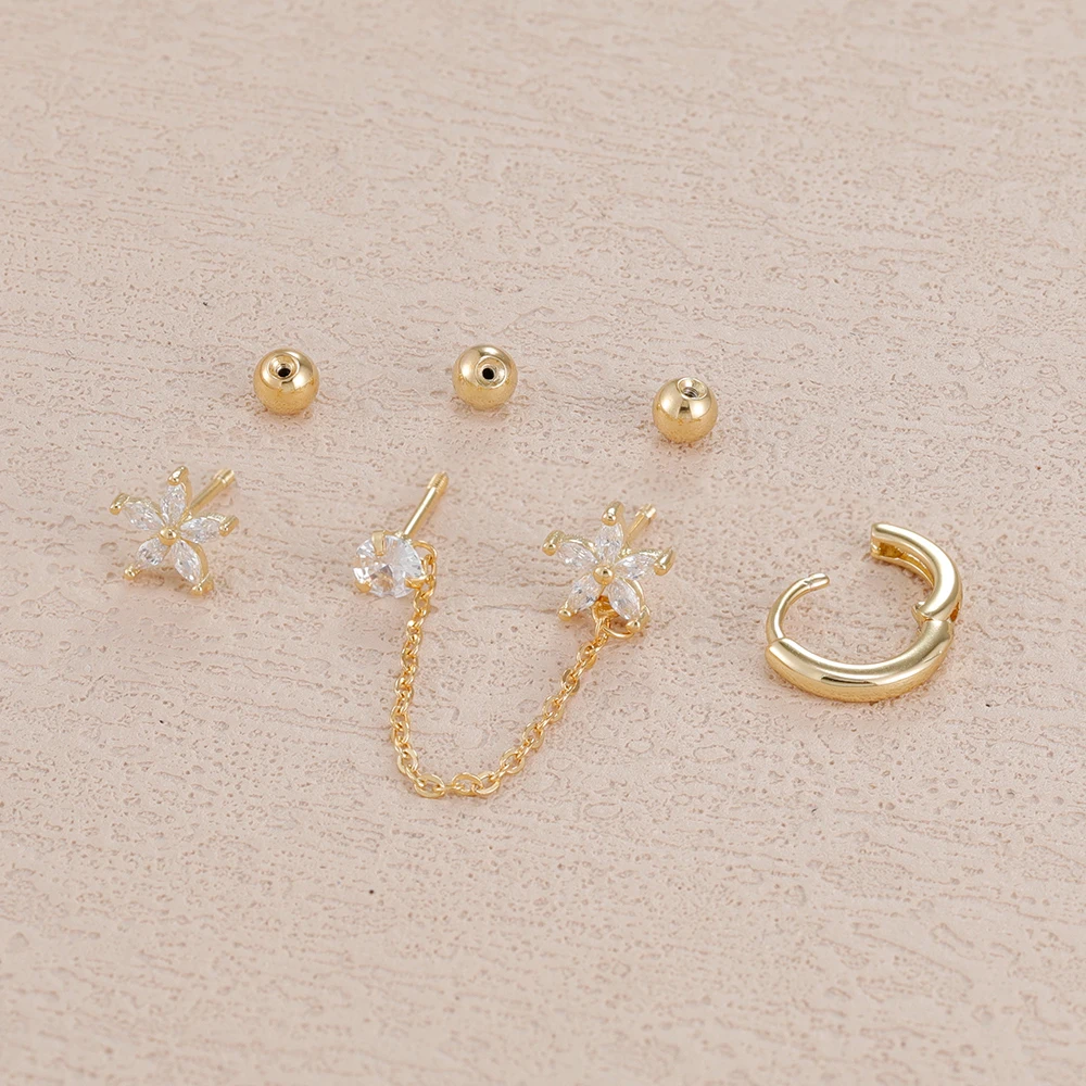 3PCS Stainless Steel Zircon Flower Star Ear Stud Earrings Set 14K Gold Plated Chain Cartilage Piercing Earring Women's Jewelry
