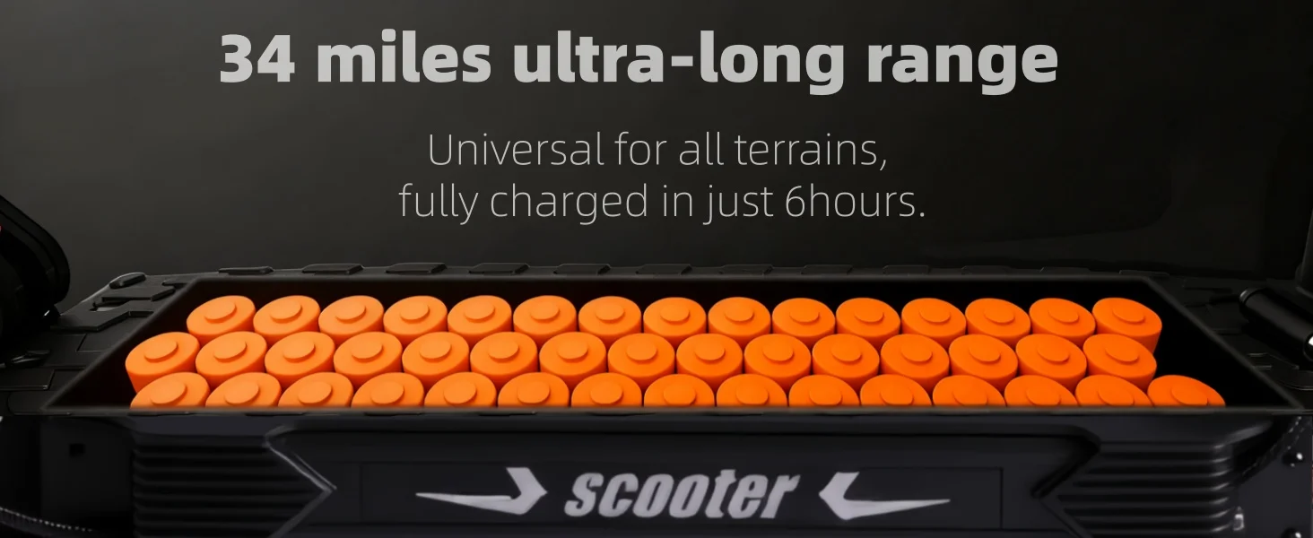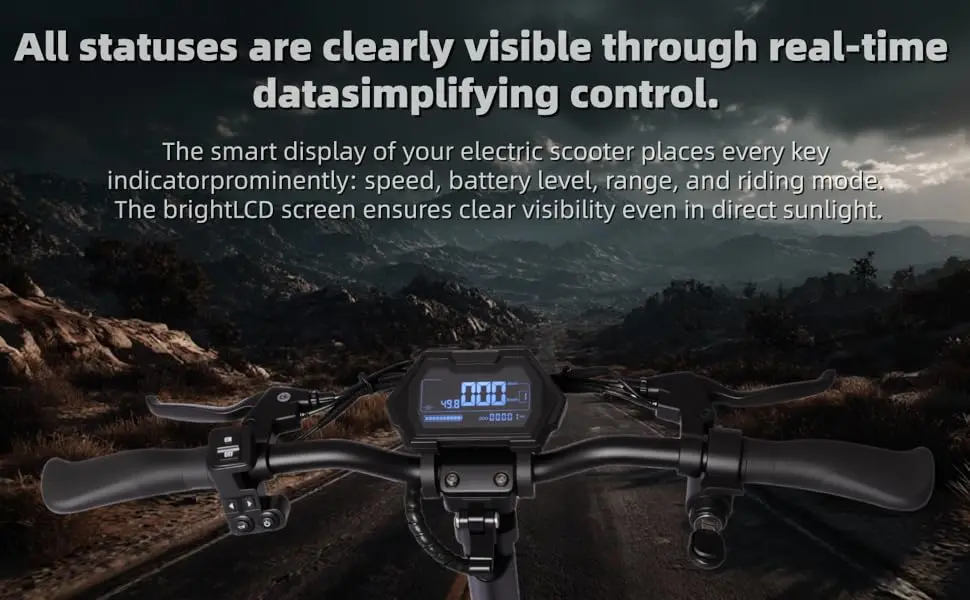 This electric scooter features a 1200W brushless motor, delivering a top speed of 40mph. It handles slopes up to 45 degrees and supports a 441 lbs load. Perfect for commuting, school, or exploring trails, it ensures stable and efficient travel on various terrains. Experience unmatched speed and reliability with this high-performance motor.