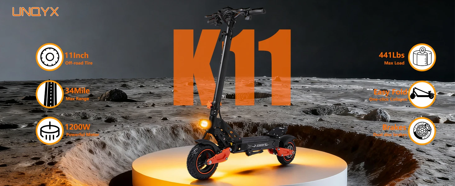 With 11-inch off-road tires, this scooter provides improved wear resistance and stability. The LED display offers real-time updates, and low/high-speed modes enhance safety. The complete lighting system and waterproof performance ensure safe riding in rainy or nighttime conditions.