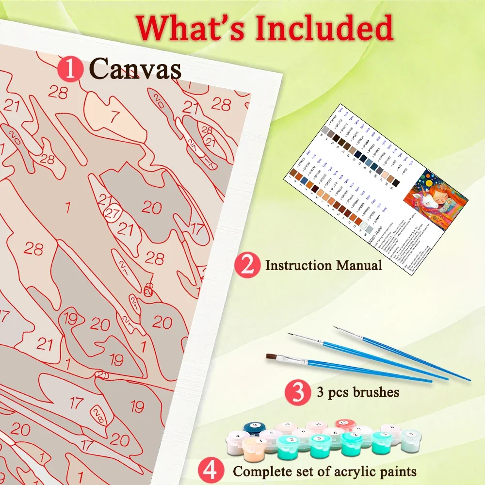 ☀Paint by Number Kits : This paint-by-number kits include all the tools needed for painting, canvas*1, 3 brushes, paint, instruction manual*1