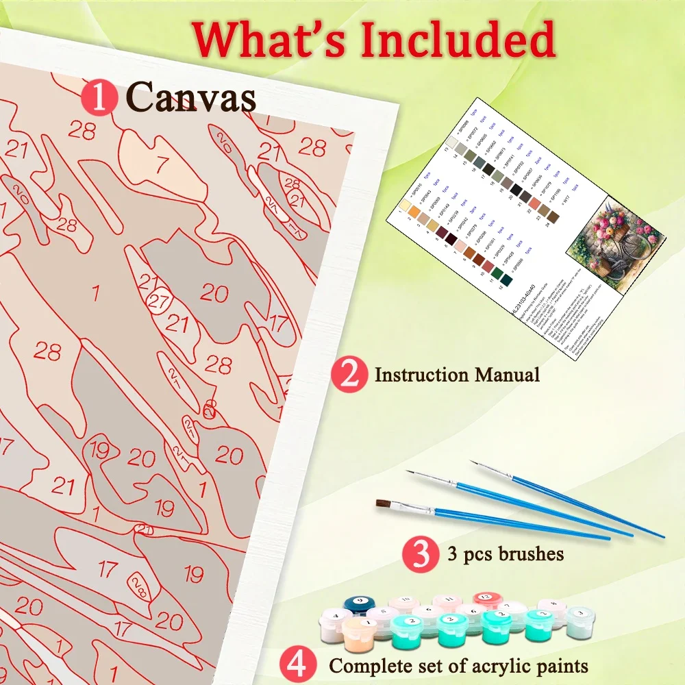 ☀Paint by Number Kits : This paint-by-number kits include all the tools needed for painting, canvas*1, 3 brushes, paint, instruction manual*1