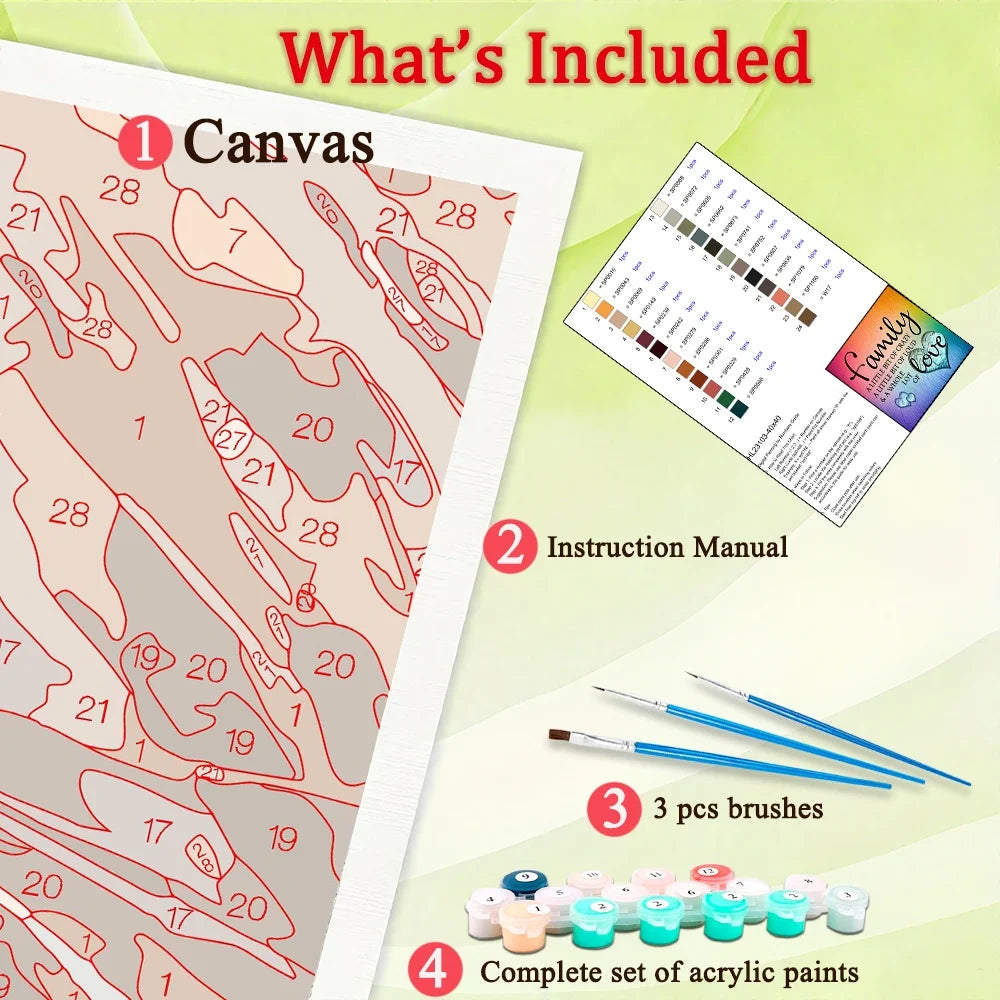 ☀Paint by Number Kits : This paint-by-number kits include all the tools needed for painting, canvas*1, 3 brushes, paint, instruction manual*1