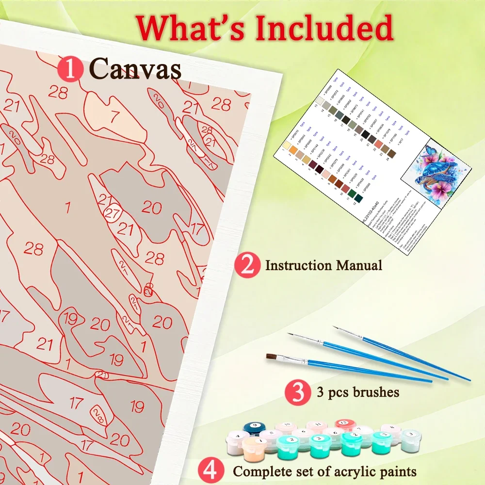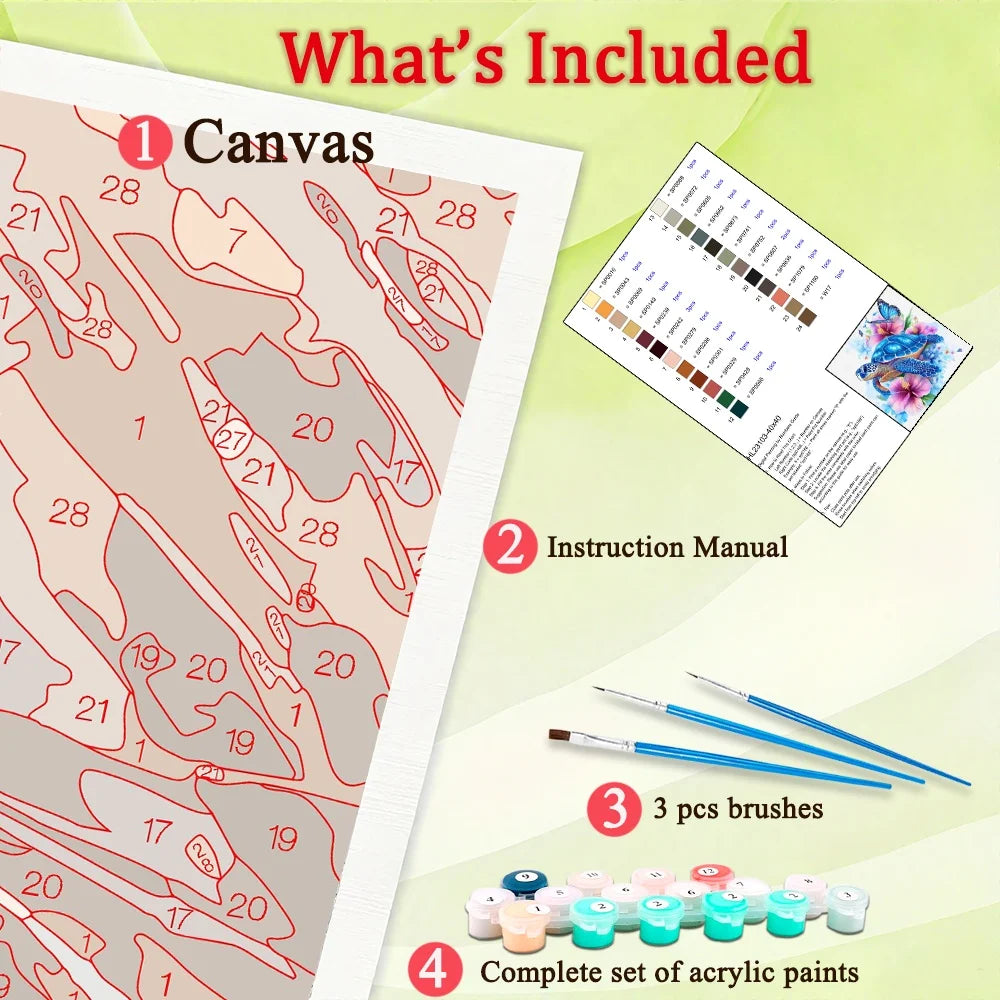 ☀Paint by Number Kits : This paint-by-number kits include all the tools needed for painting, canvas*1, 3 brushes, paint, instruction manual*1