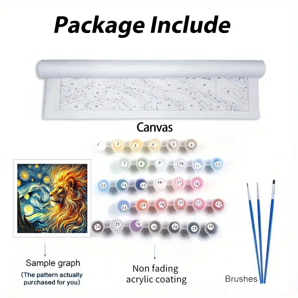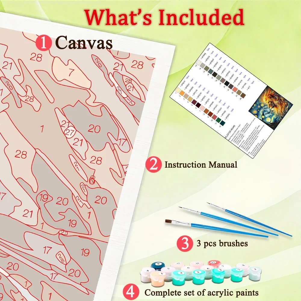 ☀Paint by Number Kits : This paint-by-number kits include all the tools needed for painting, canvas*1, 3 brushes, paint, instruction manual*1